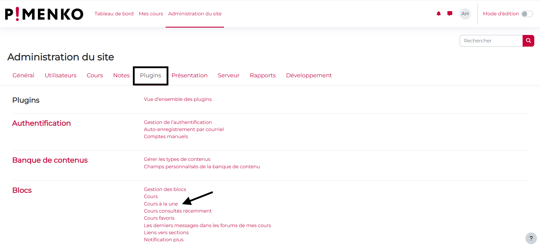 Étape 1. Cliquez sur « Administration du site » puis dans l’onglet « Plugins ». Vous trouverez un lien « Cours à la une ».