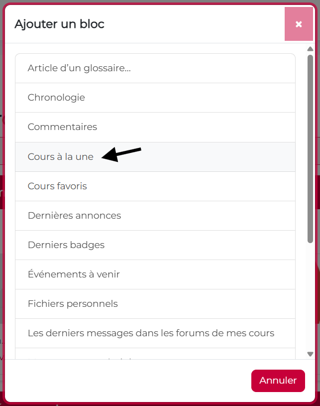Lorsque le plugin est installé sur le site, le bloc « Cours en à la une » apparait dans la liste des blocs disponibles aussi bien sur la page d’accueil, sur le tableau de bord ou dans les cours.