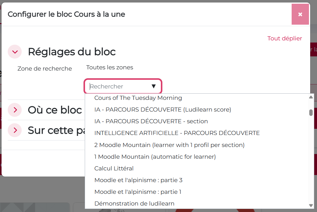Chaque bloc « Cours en à la une » est indépendant. Vous pouvez donc ajouter des blocs sur différentes pages et sélectionner à chaque fois des cours différents.