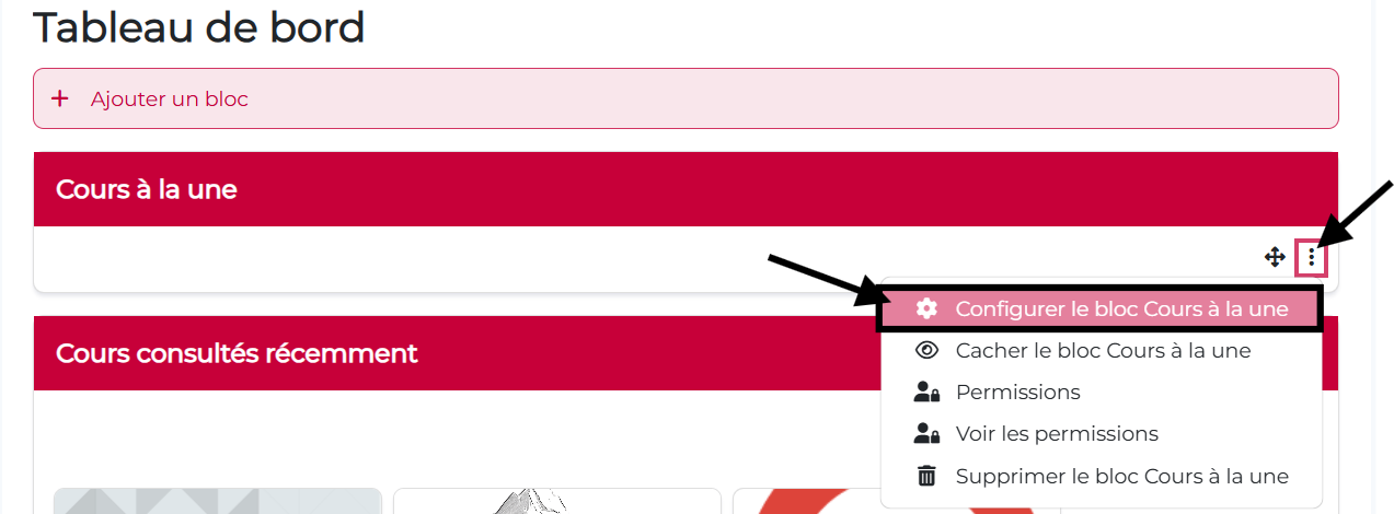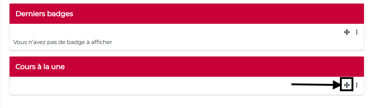 Étape 4. Le bloc « Cours à la une » apparaitra automatiquement en dernier sur votre tableau de bord. Vous pouvez le déplacer à votre convenance en utilisant le bouton « glisser/déposer ».