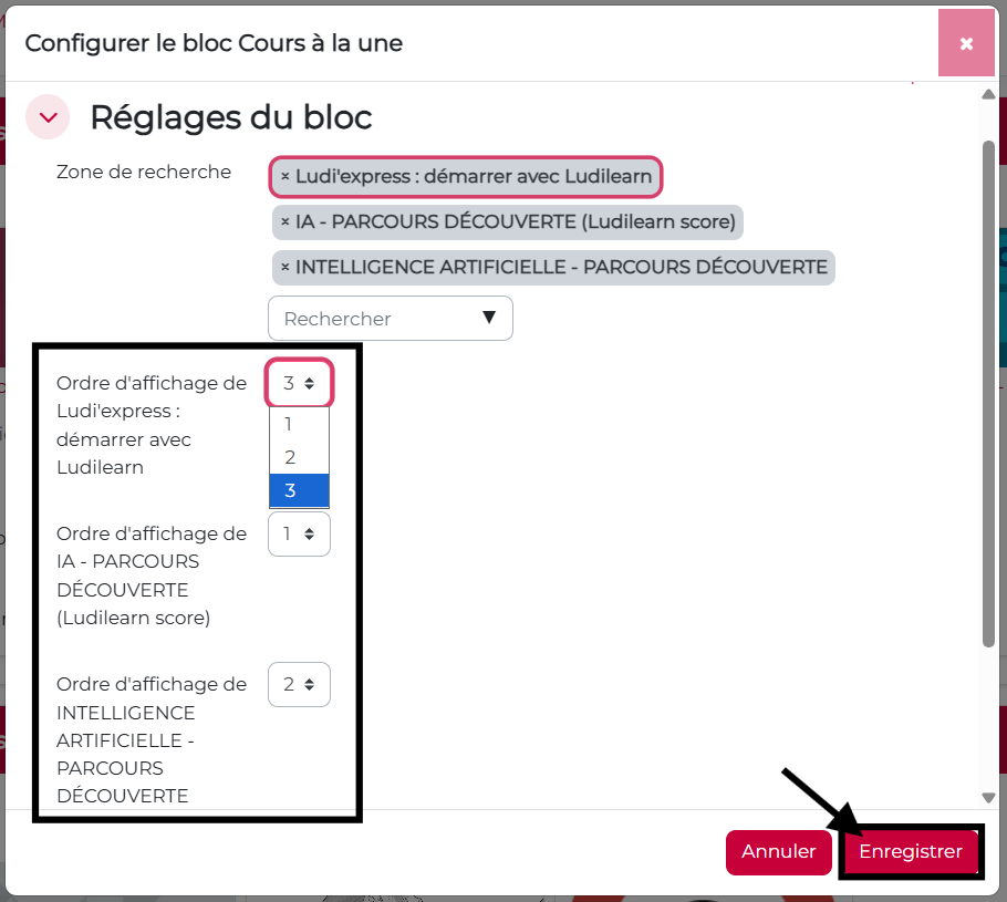 Étape 7. Les cours apparaitront dans l’ordre de votre sélection lorsque vous cliquez sur enregistrer. Si vous souhaitez modifier l’ordre, allez de nouveau dans « configurer le bloc cours à la une » et modifier l’ordre.