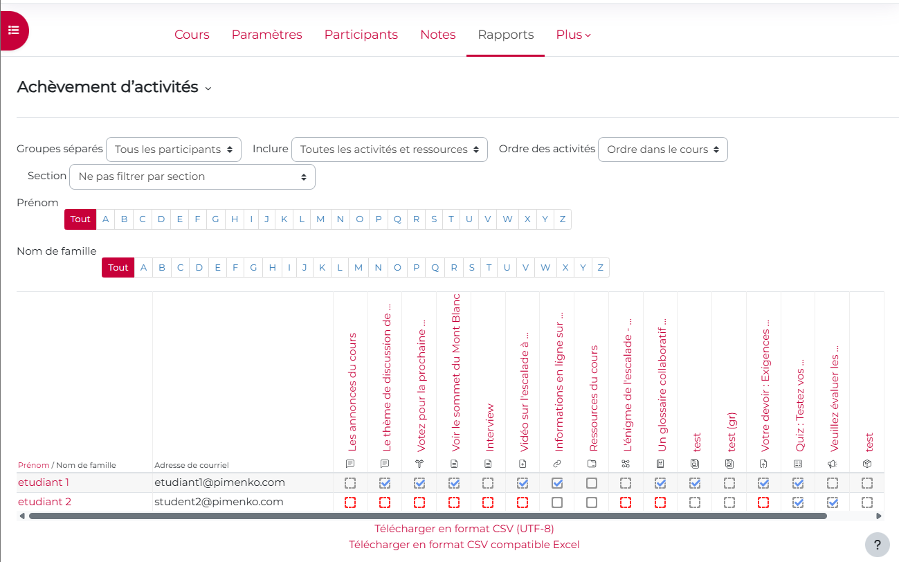 La liste des utilisateurs est présentée à gauche. Toutes les ressources et les activités sont présentées sous la forme de colonne avec l’état de la progression.