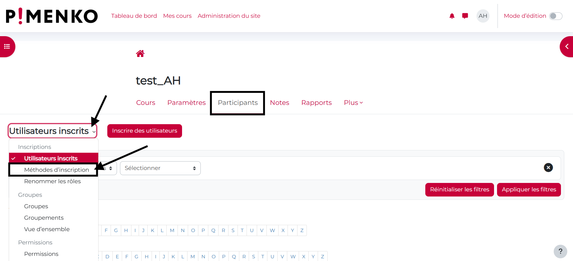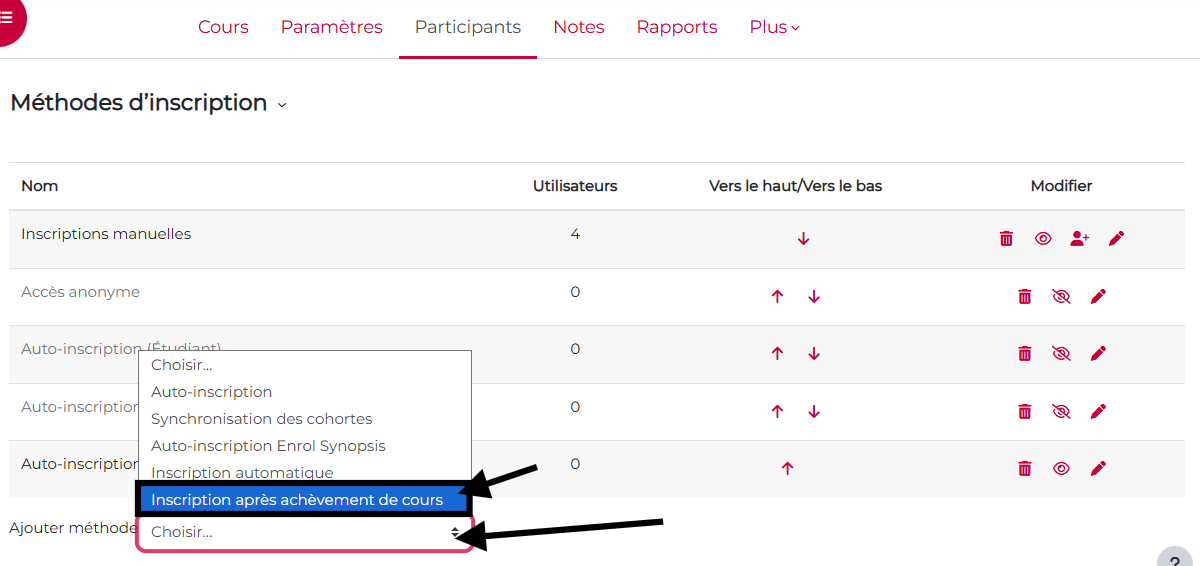 Cliquez sur « Participants » dans le menu du cours, puis sélectionnez « Méthodes d’inscription » dans la liste déroulante :