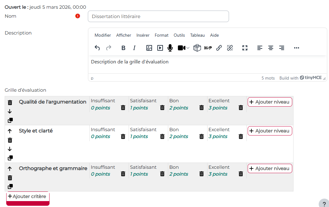 Puis elle clique sur « + Ajouter niveau » pour ajouter un quatrième niveaux de performance. Par exemple, pour la « Qualité de l’argumentation », les niveaux pourraient être « Insuffisant », « Satisfaisant »,« Bon » et « Excellent ».