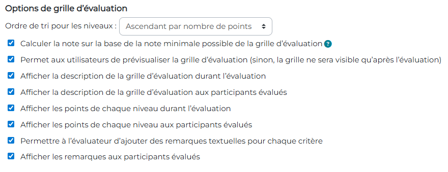 - Ordre de tri pour les niveaux – Ascendant par nombre de points : Organise les niveaux de performance de manière croissante selon les points, clarifiant la progression attendue dans chaque critère.