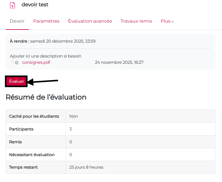 L’activité « devoir » permet d’évaluer les apprentissages des participants. Cela prend généralement la forme d’un document numérique (.pdf, document de bureautique, son, vidéo, etc) que les participants déposent sur le site ou d’un texte en ligne directement écrit sur le site.