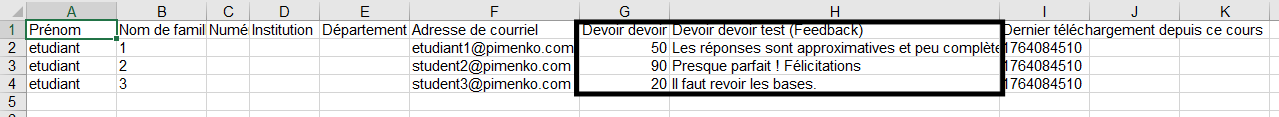 Dans cet exemple, nous n’avons sélectionné l’export que du « devoir test » et nous avons coché la case « Inclure les feedbacks dans l’exportation » pour pouvoir avoir à la fois les notes et le feedback par commentaire.