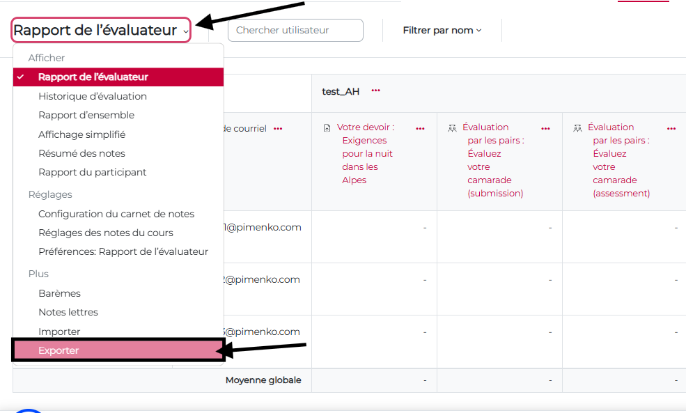 Cliquez sur le menu « Rapport de l’évaluateur » puis « Exporter«