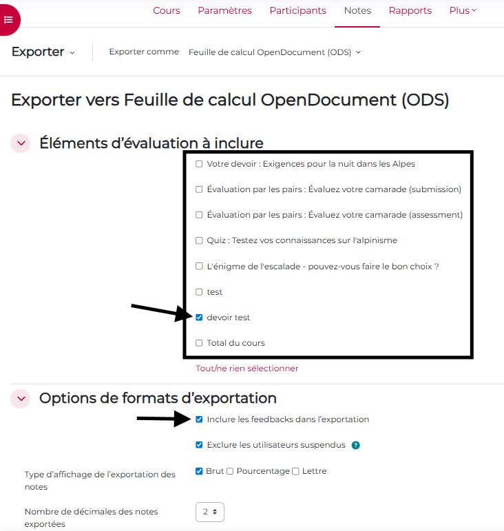 Astuce : Dans le cas d’un devoir, pensez à ouvrir la rubrique « Options de formats d’exportation« . Elle vous permettra de cocher l’option « Inclure les feedbacks dans l’exportation« . Vous pourrez exporter à la fois la note de l’activité + les feedbacks par commentaires.