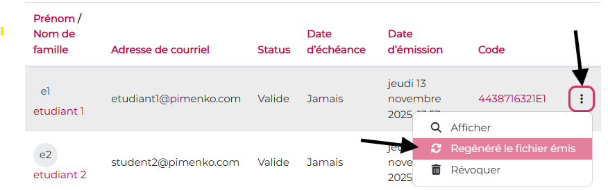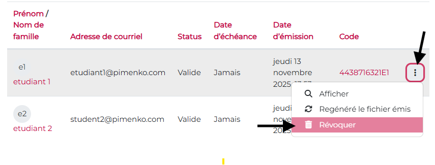 Suite à une erreur, un formateur peut avoir besoin de révoquer un certificat, ce qui permet notamment de rendre le certificat inaccessible pour l’utilisateur, c’est à dire qu’ils ne pourront plus le télécharger.