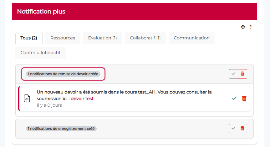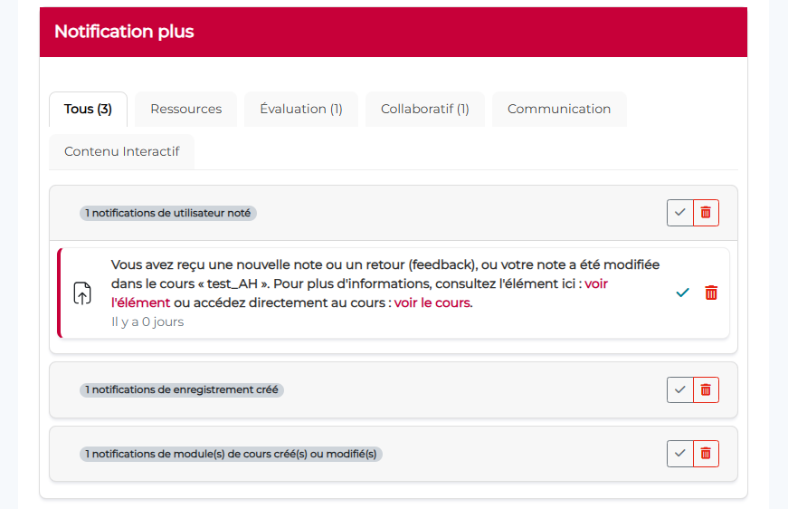 Dans l’onglet, l’apprenant comme l’enseignant peuvent choisir de supprimer ou de « marquer comme lu » une notification pour qu’elle ne s’affiche plus du tout ou passe à 0.