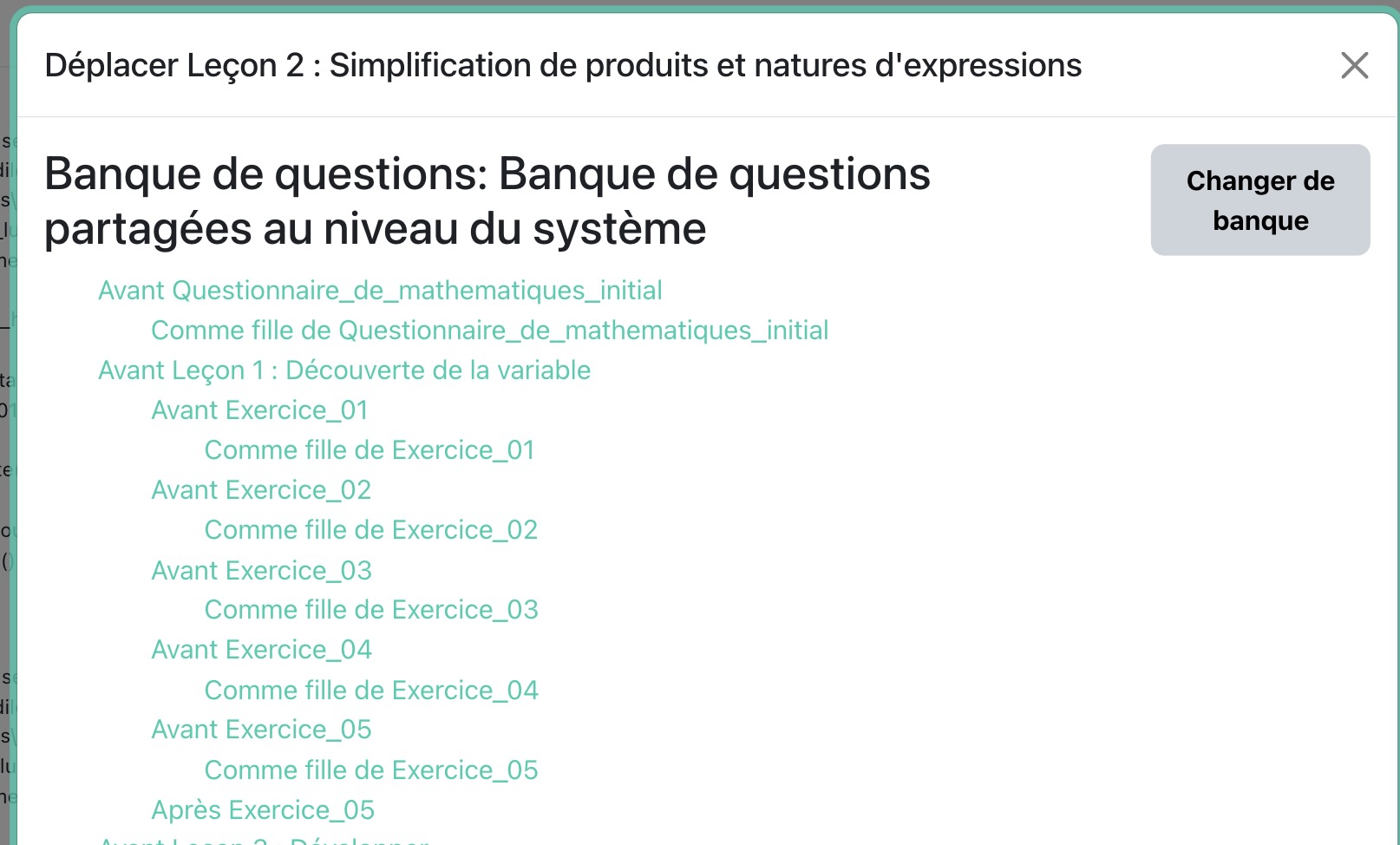 - Déplacer une catégorie entière vers une autre banque de questions, sous-catégories et questions comprises. Pratique pour restructurer vos banques entre cours ou entre contextes.